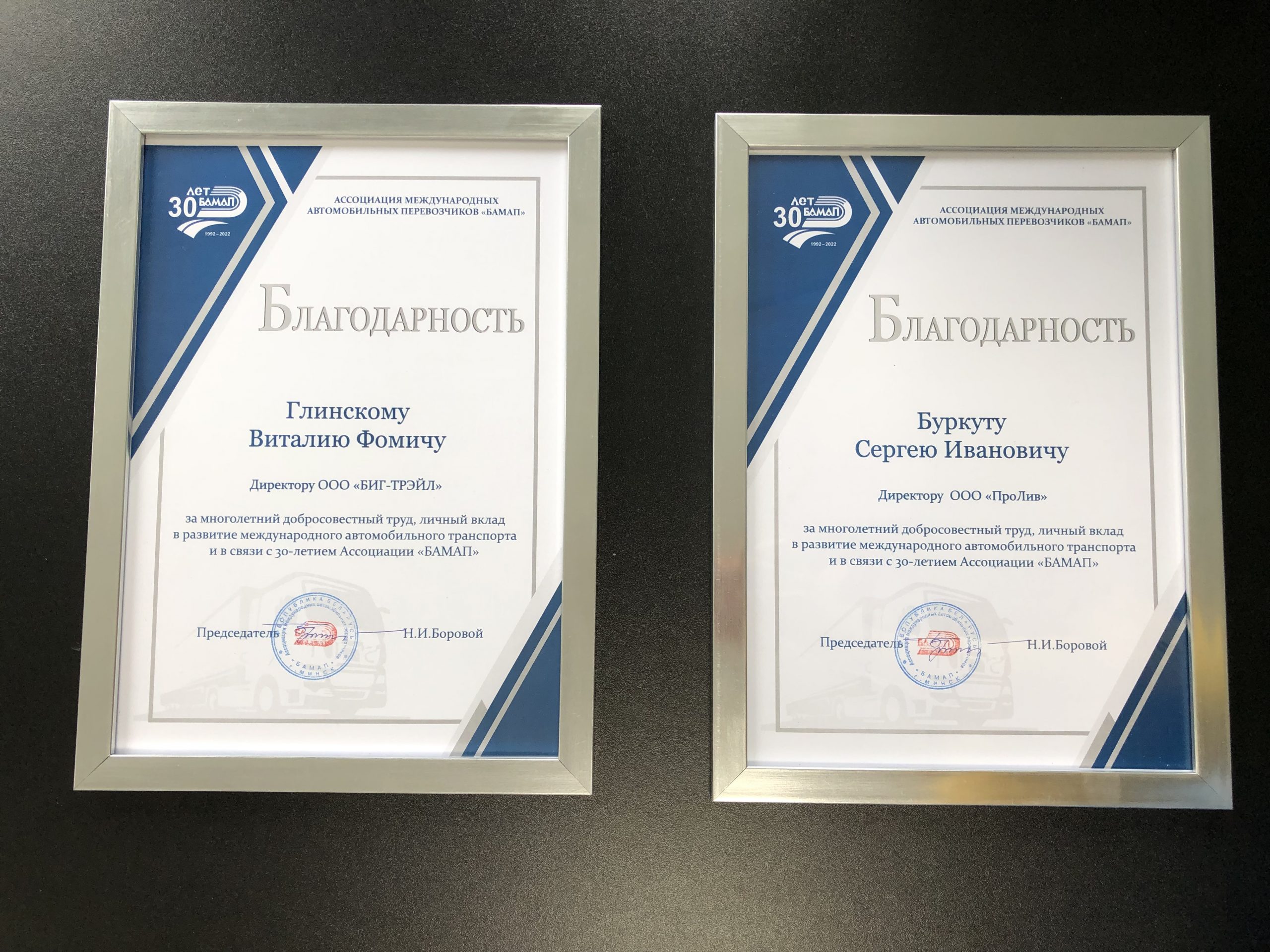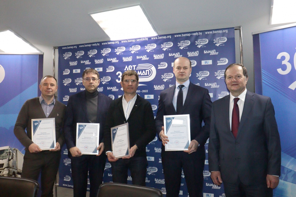 During the meeting, the Association of International Road Carriers "BAMAP", in connection with its 30th anniversary, expressed gratitude to Vitaly Fomich Hlinsky and Sergey Ivanovich Burkut for many years of conscientious work and personal contribution to the development of international transport. The Association presented the heads of the Group of Companies "ProLiv" with Gratitudes, as well as souvenirs as a sign of respect and recognition of invaluable work in the field of cargo transportation.